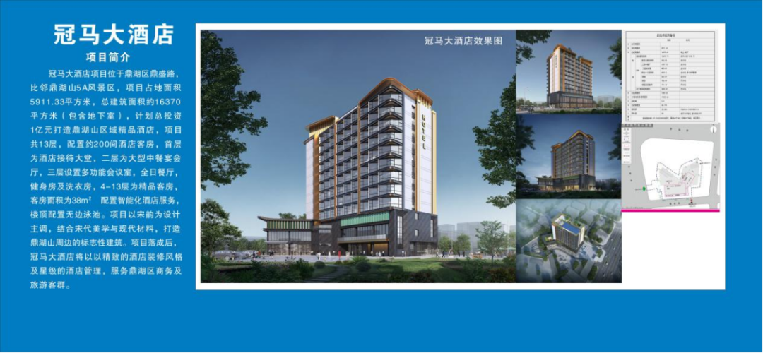 8月12日, 鼎湖区重点文旅项目—— 冠马大酒店举行动工仪式。 项目效果图 项目投资1亿元 冠马大酒店项目位于鼎湖城区鼎盛路, 毗邻国家5A级鼎湖山风景区, 项目总投资约1亿元, 总建筑面积约16370平方米(含地下室), 计划建设一栋13层高端精品酒店, 配备约200间智能化客房。 项目设计上融合宋代美学神韵与现代建筑材料,内部规划首层接待大堂、二层大型中餐宴会厅、三层多功能会议室、全日餐厅及健身设施,4-13层为精品客房,楼顶配备特色无边泳池。 2027年年底投入运营 冠马大酒店项目定位为高端精品酒店, 计划于2026年年底竣工, 2027年年底正式投入运营, 将成为鼎湖山下又一新地标! 建成后将显著提升鼎湖区域的综合旅游服务功能,为商务差旅、休闲度假的游客提供更为完善、舒适和多样化的住宿、餐饮、会议及健身等配套服务,为区域文旅产业的高质量发展注入新动力。